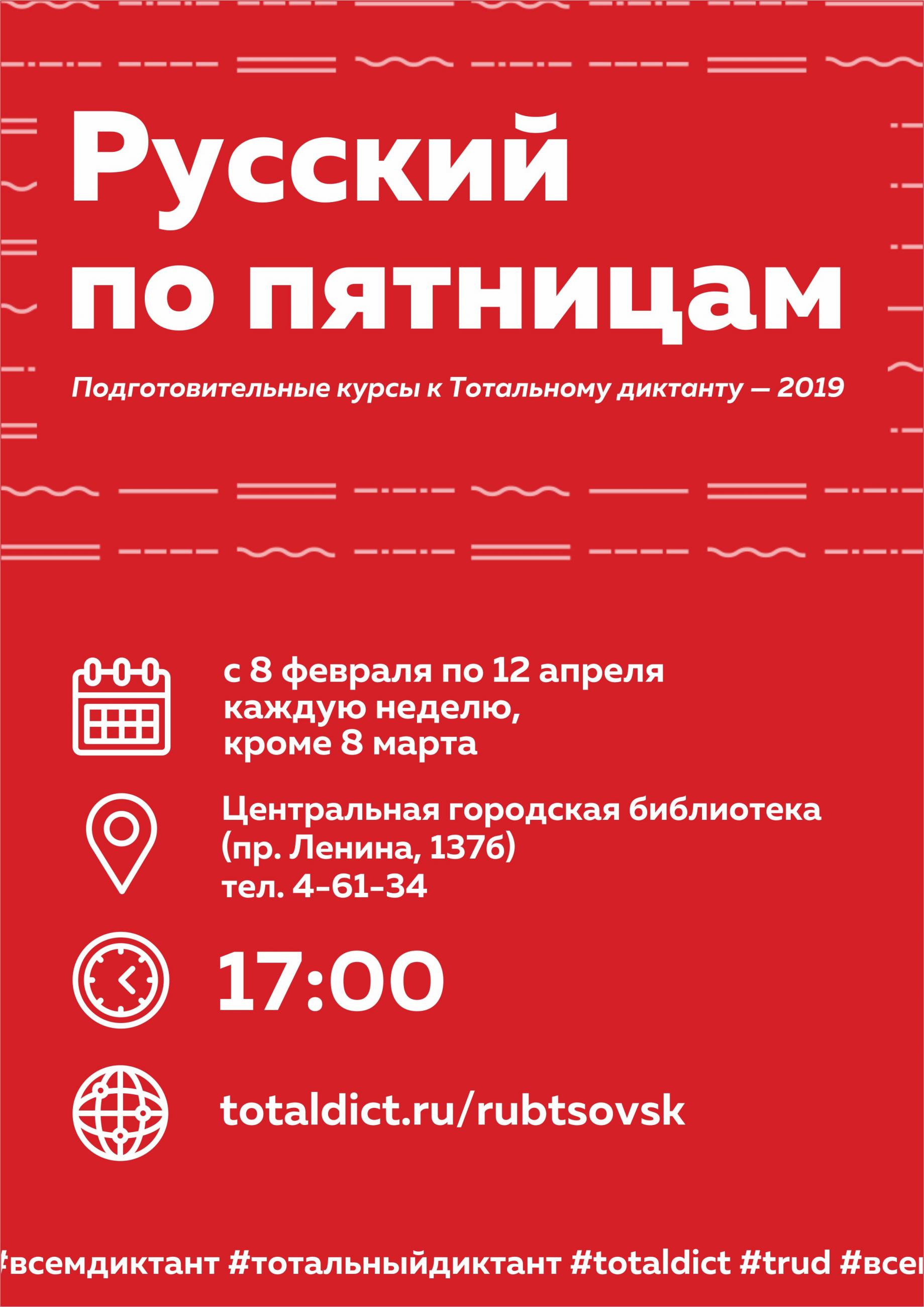 8 февраля в Рубцовске в центральной городской библиотеке начнутся бесплатные очные курсы подготовки к Тотальному диктанту*. Занятия «Русский язык по пятницам» проводит преподаватель русского языка и литературы Гимназии № 8, председатель комиссии филологов Тотального диктанта в Рубцовске Татьяна Александровна Брик. Каждую пятницу в 17 часов на девяти занятиях вы повторите по одному орфографическому и пунктуационному правилу, которые обязательно пригодятся, чтобы написать диктант 2019 года на «отлично». Вы пройдёте не весь курс русского языка, но сможете потренироваться в написании разных диктантов, обсудить с преподавателем спорные вопросы русской орфографии и пунктуации.