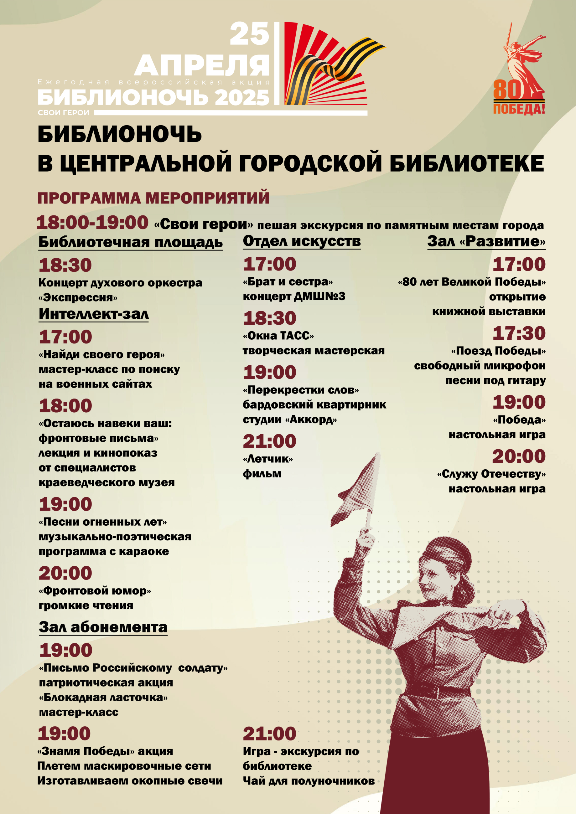 25 апреля в Рубцовске пройдет ежегодная акция «Библионочь», тема этого года – «Свои герои». Пять библиотек города превратятся в площадки памяти и почитания героев: