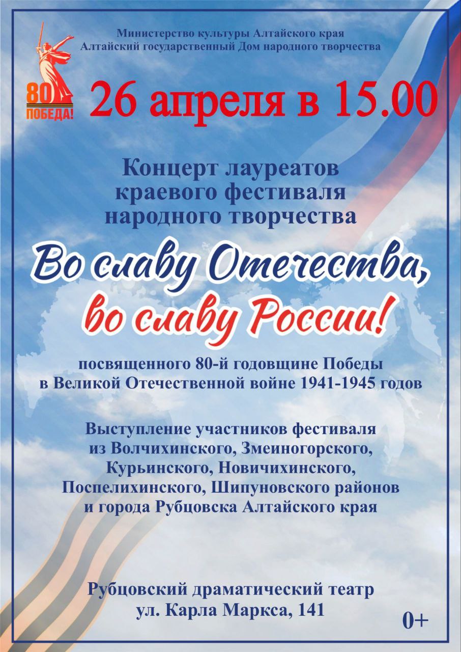 26 апреля в 15:00 состоится концерт лауреатов краевого фестиваля народного творчества «Во славу Отечества, во славу России!», посвященный 80-й годовщине Победы в Великой Отечественной войне.