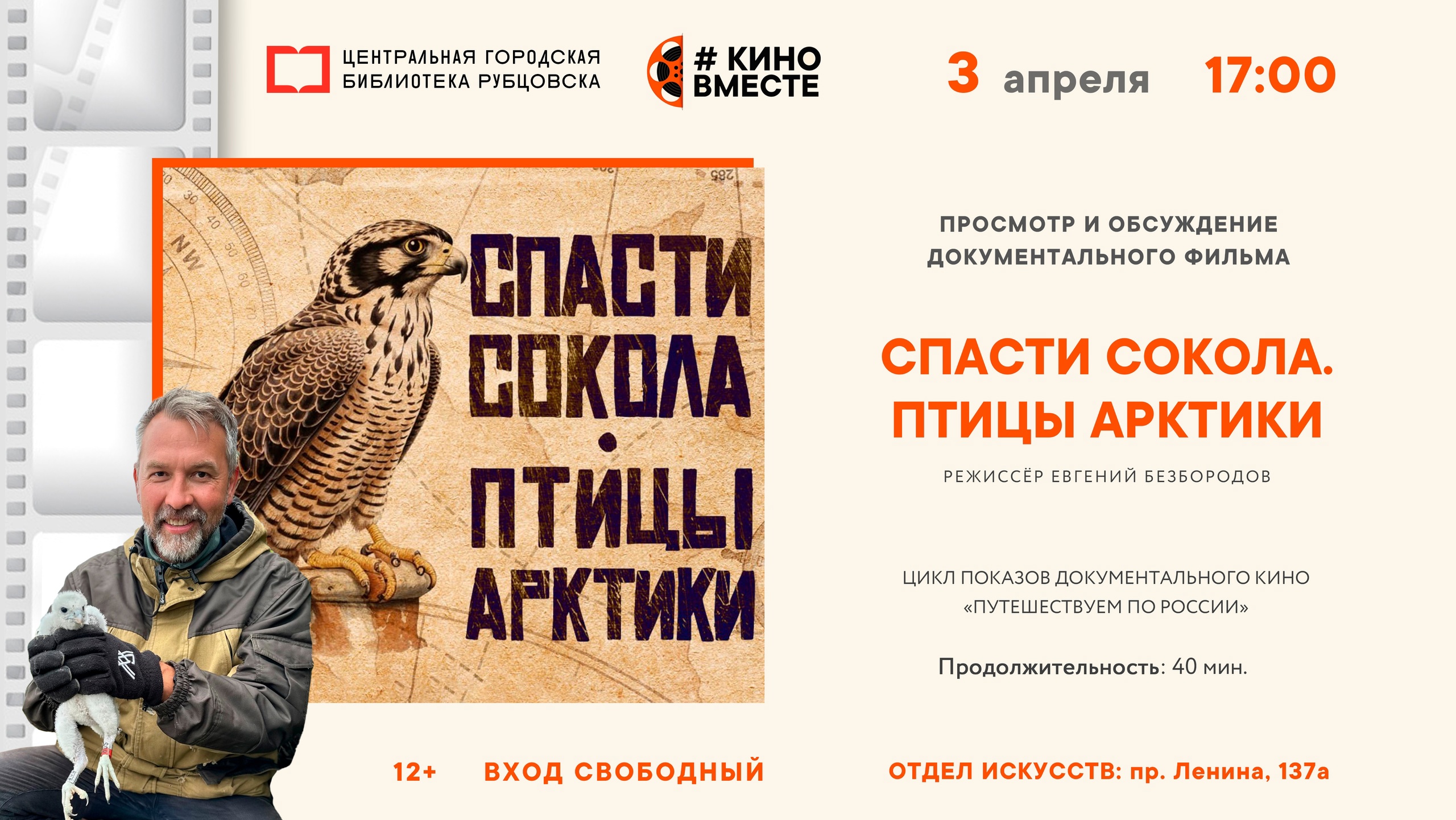 3 апреля в 17:00 в киноклубе #Киновместе в Центральной городской библиотеке состоится показ документального фильма «Спасти сокола. Птицы Арктики», эксклюзивно предоставленного режиссёром-документалистом Евгением Безбородовым.Фильм пока можно увидеть только на фестивалях, в эфире он ещё не был.