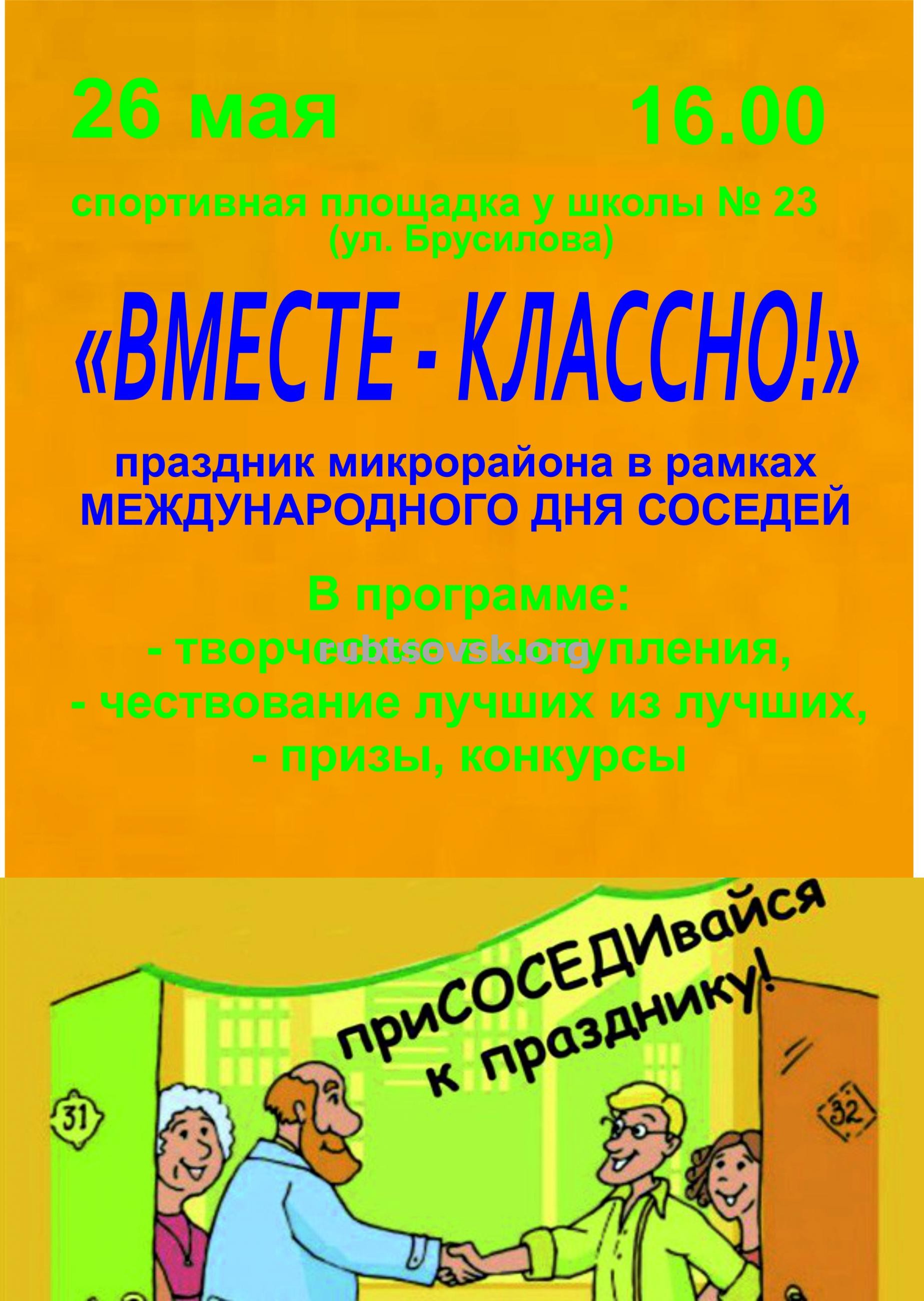 В рамках IV Всероссийской акции "Международный день соседей" 26-27 мая на территории города будут организованы: праздник двора "Встреча друзей" на микрорайоне "Черемушки" и творческая программа "Вместе-классно!" на микрорайоне "Западный".