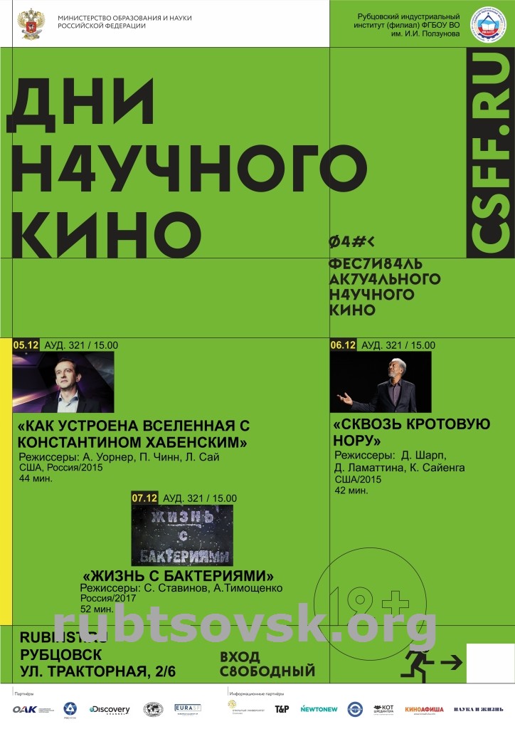 С 5 по 7 декабря в Рубцовском индустриальном институте покажут самые актуальные научные фильмы всем желающим в рамках Дней научного кино ФАНК. Проект проходит при поддержке Министерства образования и науки РФ. ФАНК третий год подряд проводит масштабный просветительский проект в российских вузах – Дни научного кино ФАНК.
