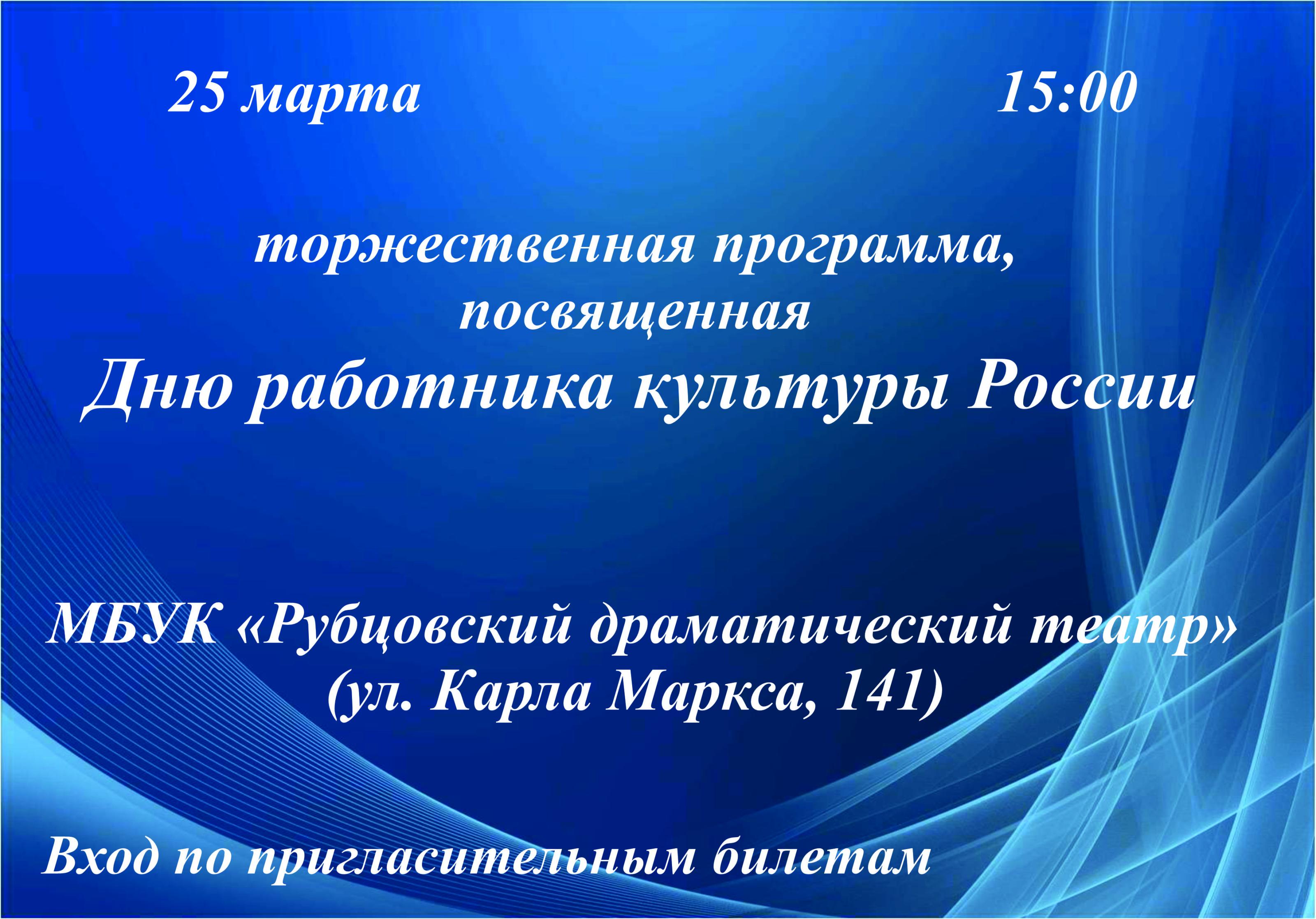 25 марта в Рубцовском драматическом театре пройдет торжественная программа, посвященная Дню работника культуры России! Этот день — отличный повод отметить труд тех, кто ежедневно вдохновляет нас своим искусством, создает уникальные произведения и сохраняет культурные традиции. В программе — выступления артистов, музыкальные номера и специальные гости, которые сделают праздник незабываемым.