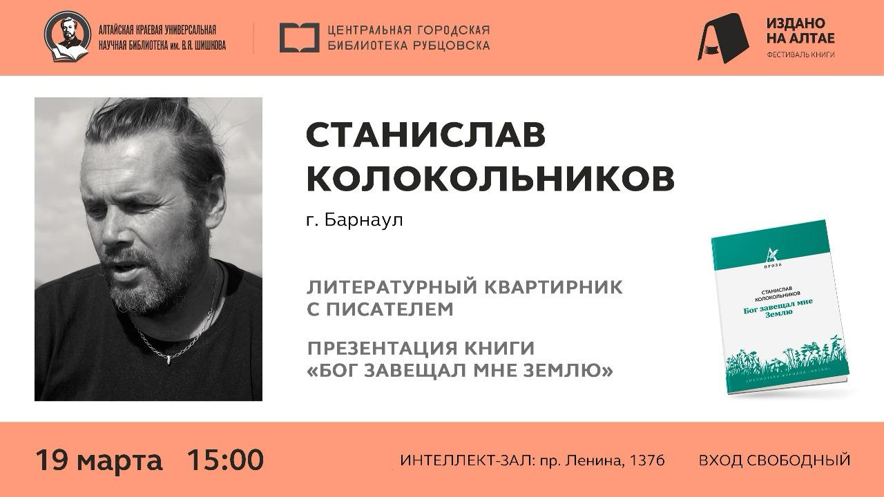 19 марта в 15 часов в Центральной городской библиотеке в рамках краевого фестиваля книги «Издано на Алтае» состоится литературный квартирник Станислава Колокольникова. Гость из Барнаула, презентует свою новую книгу «Бог завещал мне землю». Книга издана по краевому издательскому проекту на средства, выделенные Правительством Алтайского края.
