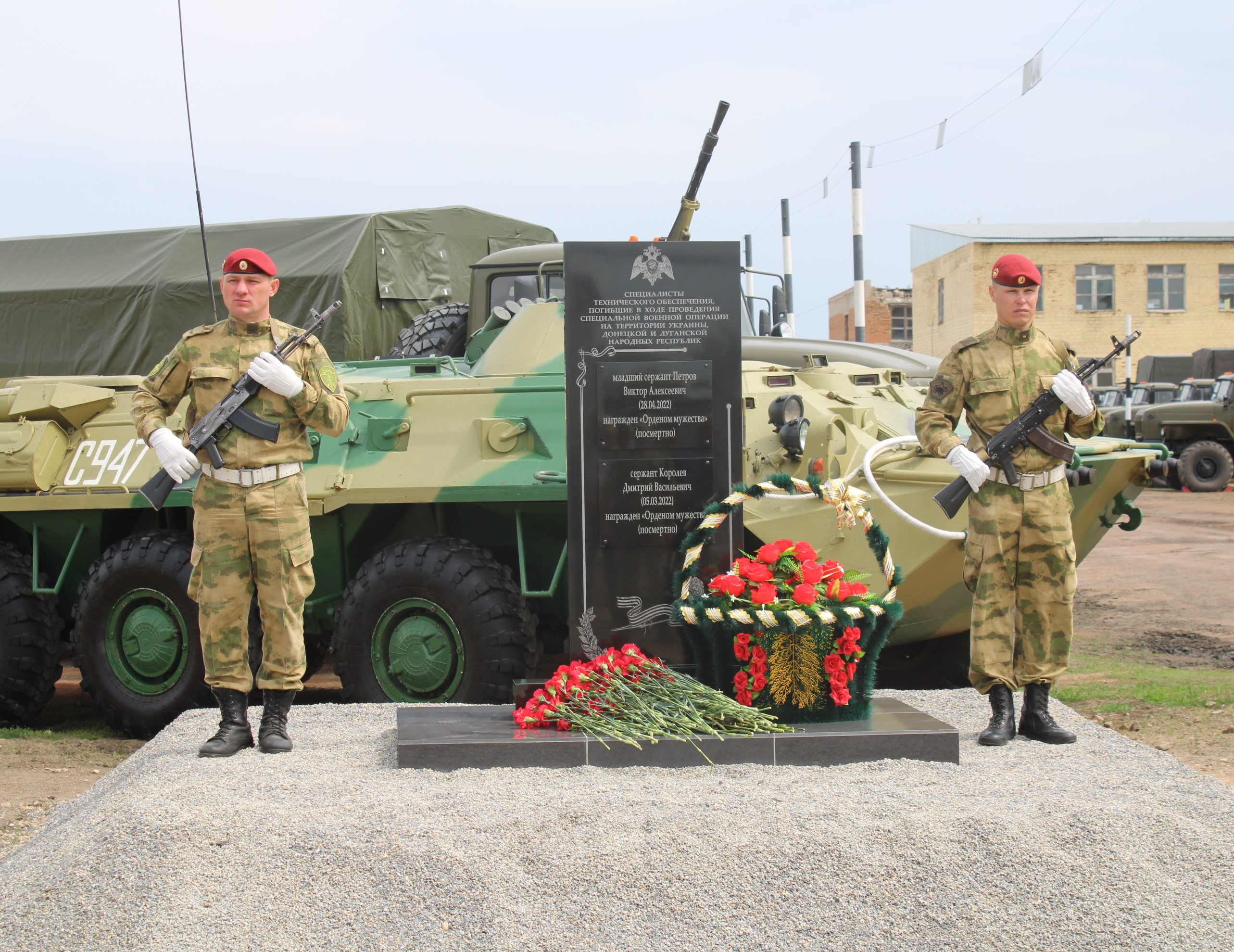 Памятник установлен в честь наших земляков - специалистов технического обеспечения полка оперативного назначения Росгвардии СибО ВНГ РФ младшего сержанта Виктора Петрова и сержанта Дмитрия Королева.