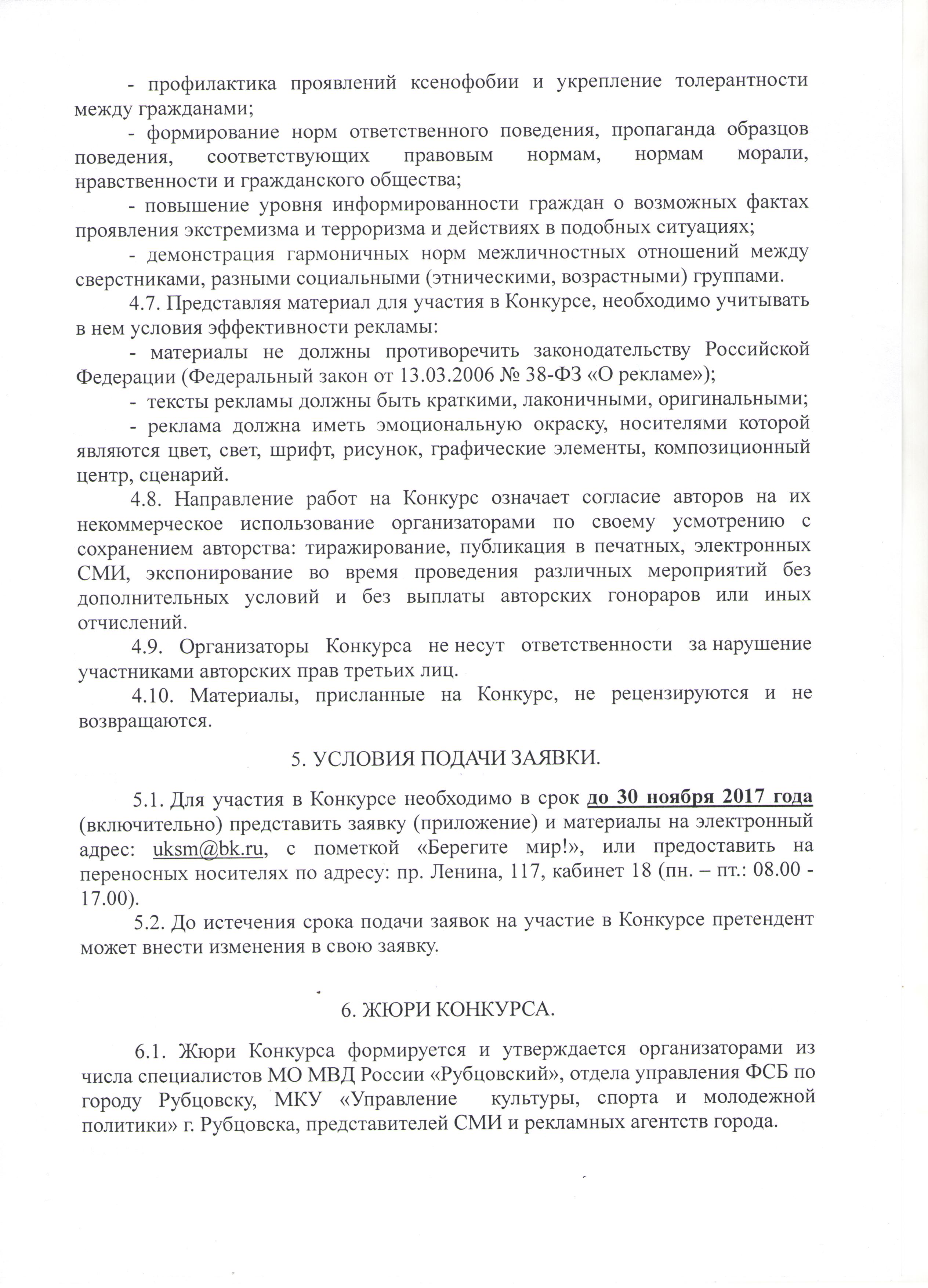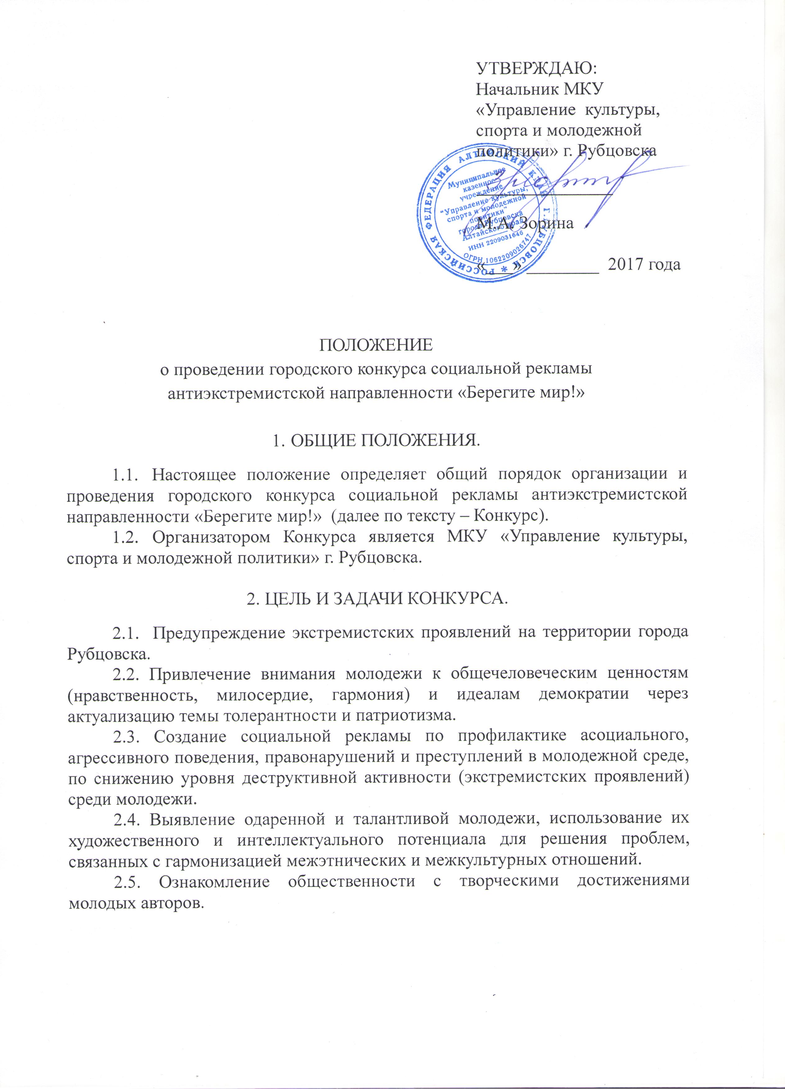 С 1 ноября 2017 года в Рубцовске стартует городской конкурс социальной рекламы антиэкстремистской направленности «Берегите мир!». Конкурс объявлен в рамках реализации муниципальной программы «Профилактика экстремизма, а также минимизация и (или) ликвидация последствий проявлений экстремизма на территории города Рубцовска» на 2017 – 2020 годы.