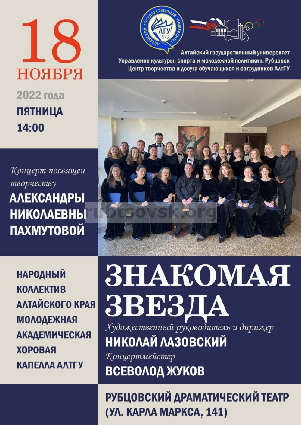 8 ноября в 14.00 в Рубцовском драматическом театре состоится концерт Молодёжной академической хоровой капеллы Алтайского государственного университета (г. Барнаул) «Знакомая звезда». Концерт организован в рамках 45-го юбилейного сезона коллектива и посвящен творчеству всенародно любимого композитора Александры Пахмутовой. Данная встреча станет подарком для всех жителей Рубцовска, вход на концерт свободный.