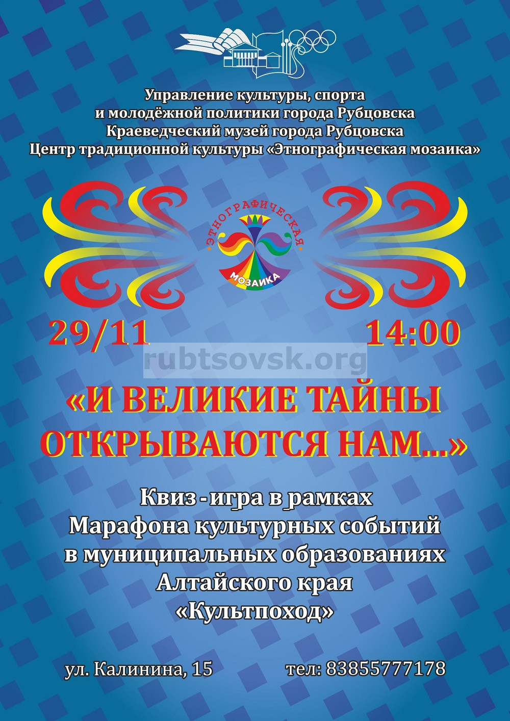 Алтайский край удивительный регион нашей большой страны, который знаменит богатствами природы и уникальностью культуры. Множество удивительных памятников природы, мистика алтайского горлового пения и шаманизма. Всё это лишь малая часть особенностей, характерных для нашей местности. О них можно рассказывать часами, но лучше всего знакомиться при помощи игры. Для этого в городе Рубцовске в рамках реализации мероприятий Марафона культурных событий в муниципальных образованиях Алтайского края «Культпоход» на базе Центра традиционной культуры «Этнографическая мозаика» Картинной галереи им. В.В. Тихонова продолжается цикл квиз-игр для молодежи, которые будут расширять кругозор, знакомить с особенностями региона, создавать патриотическое настроение, помогать познавать добро и красоту.