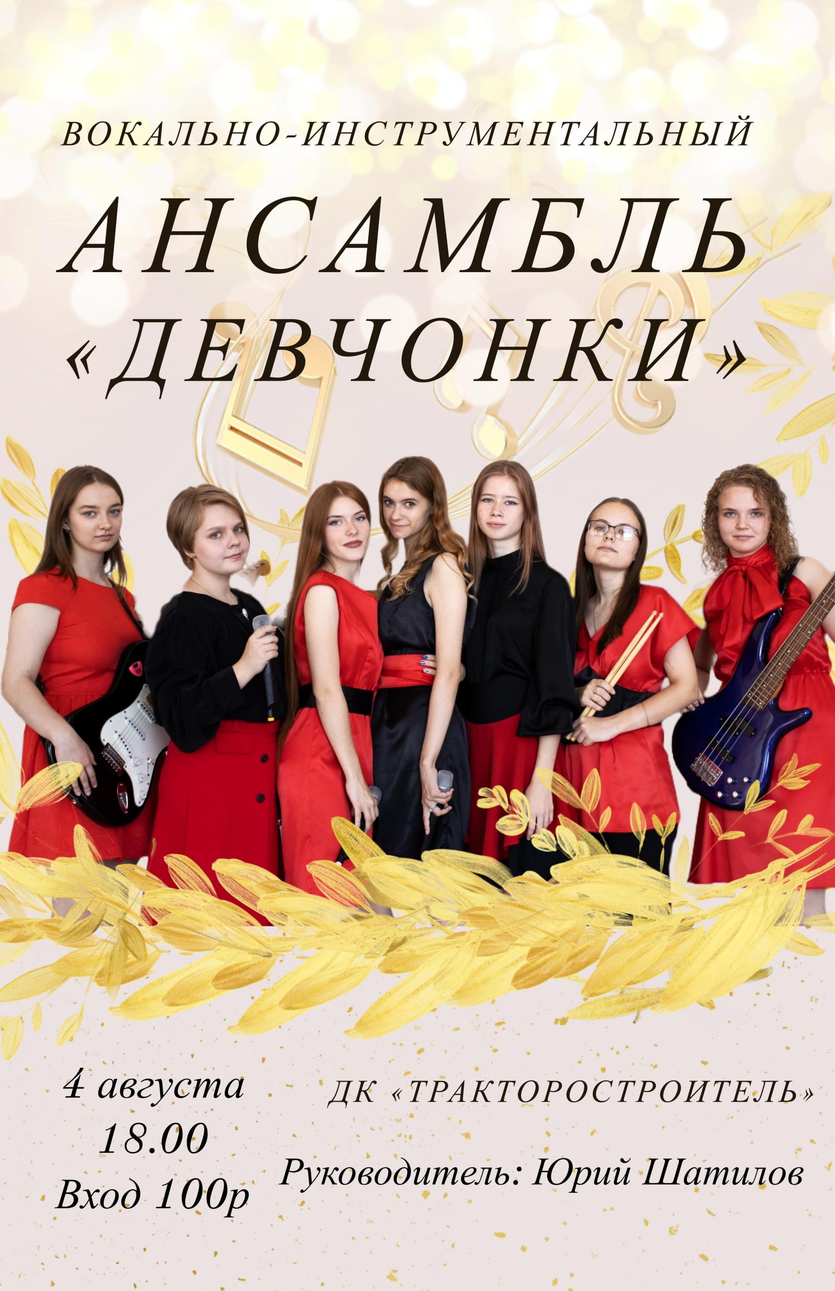 4 августа в 18.00 на большой сцене Дворца культуры "Тракторостроитель" состоится Отчетный концерт Вокально-инструментального ансамбля «Девчонки» (руководитель - Заслуженный работник культуры Юрий Григорьевич Шатилов). Буквально месяц назад на краевом конкурсе "Под звездным небом Колывани" ансамбль подтвердил высокое звание "Народный коллектив самодеятельного художественного творчества". Участниц ансамбля отличает особый стиль исполнения, высокий профессионализм, сценическая культура. В программе концерта - известные хиты зарубежной и российской эстрады. Приглашаем рубцовчан и гостей города. Билеты можно приобрести в кассе ДК.