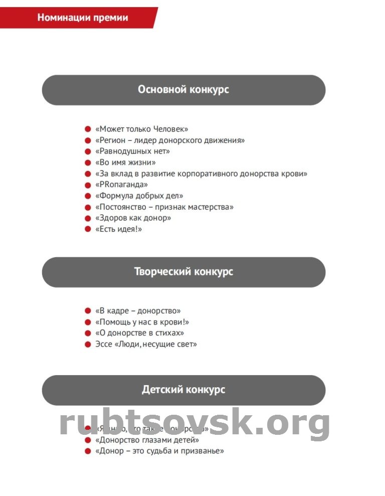 В 2017 г. расширены конкурсы премии: основной, творческий, детский; учреждены новые номинации. Второй год в рамках премии будет вручаться специальный приз за создание условий открытости, доступности, комфортности в учреждениях Службы крови – «Мы работаем для вас. Знак качества». Для успешной подготовки заявки организаторами разработано подробное Руководство конкурсанта VIII Всероссийской премии за вклад в развитие донорства крови «СоУчастие» Напомним, что Всероссийская премия за вклад в развитие донорства крови «СоУчастие» учреждена в 2010 году Национальным фондом развития здравоохранения и Координационным центром по организации, развитию и пропаганде добровольного донорства крови при Общественной палате РФ.