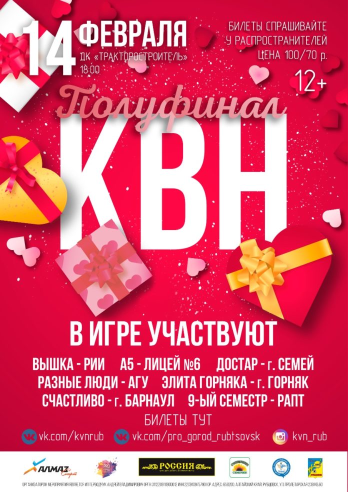 14 февраля в 18:00 в ДК «Тракторостроитель» пройдет ½ финала Рубцовской лиги КВН в которой встретятся 7 команд из Рубцовска, Барнаула, Горняка, Семея (Республика Казахстан). К игре команды готовят традиционные для КВНа конкурсы: приветствие, разминку и домашнее задание. Спрашивайте билеты у распространителей. Со списком распространителей можно ознакомиться в группе Рубцовской лиги КВН в Контакте https://vk.com/kvnrub .
