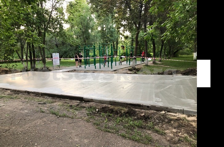 На данный момент закончены работы по созданию бетонного основания, где впоследствии будет укатана резиновая крошка и установлен тренажерный комплекс. В настоящее время ход на площадку запрещен в связи с проведением строительных работ.