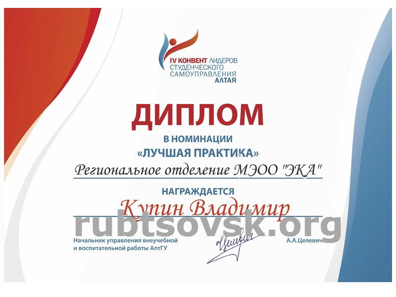 IV конвент лидеров студенческого самоуправления Алтая собрал на площадке Алтайского государственного университета активную, полную прогрессивных идей и начинаний молодежь. В числе участников свой проект «Региональное отделение МЭОО «ЭКА» представил студент Рубцовского Института (филиала)АлтГУ Владимир Купин.