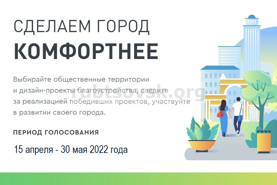 С 15 апреля по 30 мая 2022 года на территории города Рубцовска пройдет голосование в электронной форме в информационно-телекоммуникационной сети «Интернет» по отбору общественных территорий, подлежащих благоустройству в 2023 году.