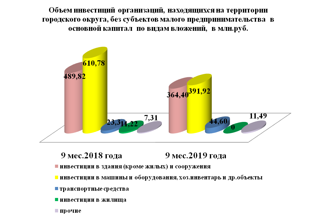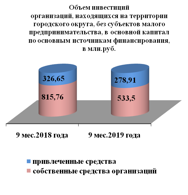 Инвестиции в основной капитал по организациям, находящимся на территории городского округа без субъектов малого предпринимательства, за 9 месяцев 2019 года составили 812,408 млн. руб. или на 28,9 % меньше, чем в прошлом году.