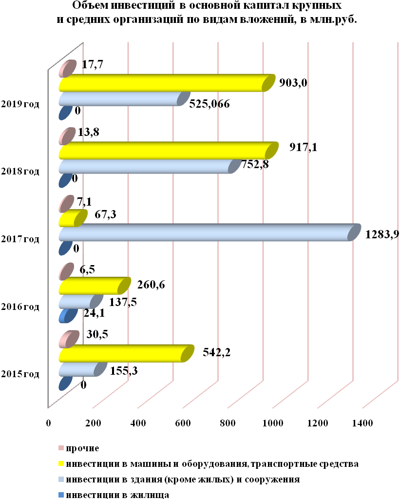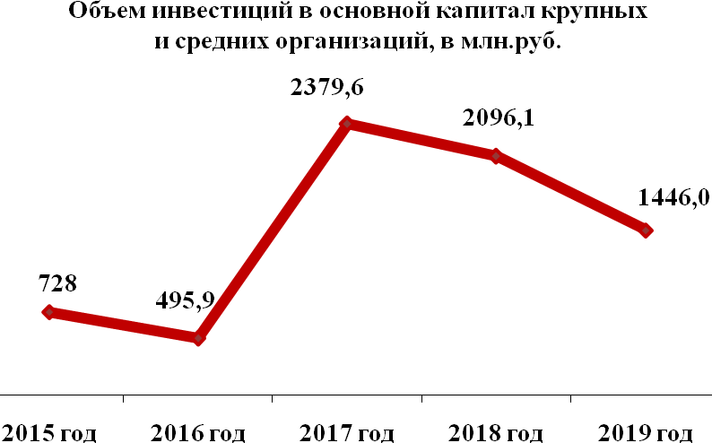 За последние 5 лет объем инвестиций в основной капитал крупных и средних организаций на территории города достигал минимальных значений около 0,5 и более 0,7 млрд. руб. в 2016 и в 2015 годах, дважды превышал значение более 2 млрд. руб. и в 2019 году стремился к значению 1,5 млрд. руб.: