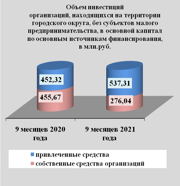 Инвестиции в основной капитал по организациям, находящимся на территории городского округа без субъектов малого предпринимательства, за 9 месяцев 2021 года составили 813,354 млн. руб. или на 6,7 % больше, чем в прошлом году.