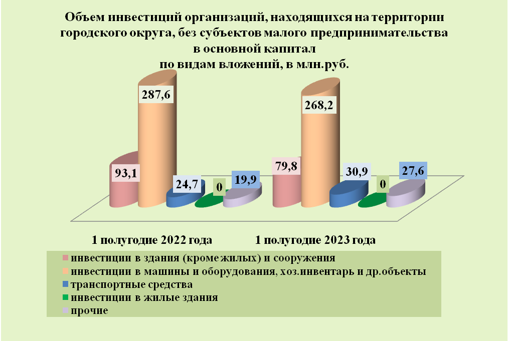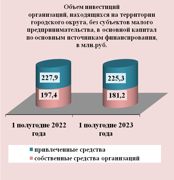 Инвестиции в основной капитал по организациям, находящимся на территории городского округа без субъектов малого предпринимательства, за 1 полугодие 2023 год составили 406,5 млн рублей, что на 18,8 млн рублей меньше прошлогоднего объема.