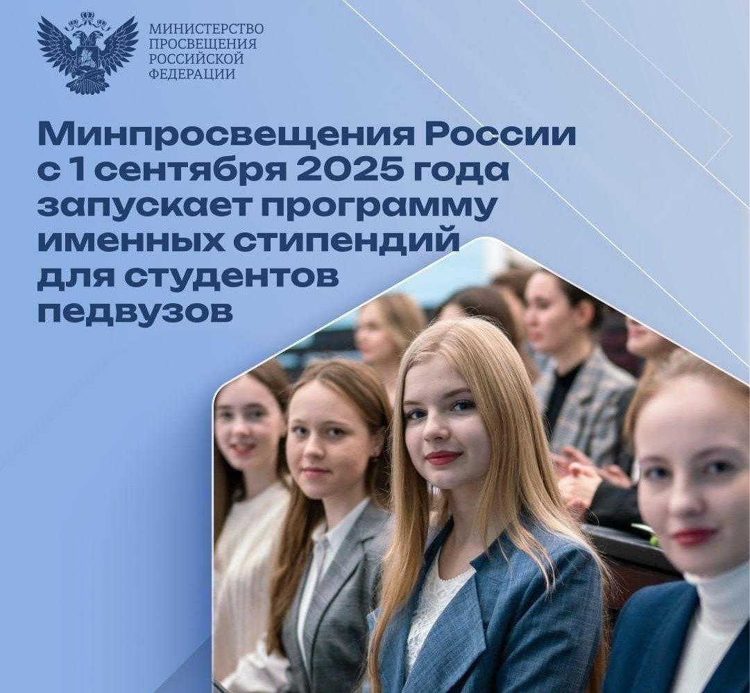 Минпросвещения России запускает программу именных стипендий для студентов педагогических вузов, направленную на поддержку талантливой молодежи, мотивацию будущих педагогов и повышение престижа профессии учителя. Именные стипендии учреждены в честь выдающихся деятелей образования России Антона Семеновича Макаренко, Василия Александровича Сухомлинского, Константина Дмитриевича Ушинского, Льва Семеновича Выготского и Николая Михайловича Карамзина. С 1 сентября 2025 года они будут ежегодно присуждаться лучшим студентам педвузов Министерством просвещения Российской Федерации ежегодно на основе конкурсного отбора. Прием документов на участие в нем начнется летом 2025 года.