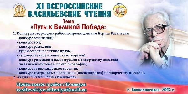 В 2025 году Россия отпразднует 80-летие Победы в Великой Отечественной войне. В честь памятной даты весной в городе Солнечногорске состоятся XI «Всероссийские Васильевские чтения». Место проведения события выбрано неслучайно. В этих местах почти 40 лет жил известный русский писатель, классик фронтовой литературы Борис Васильев – автор произведений: «А зори здесь тихие», «Офицеры», «В списках не значился», «Не стреляйте белых лебедей» и др.