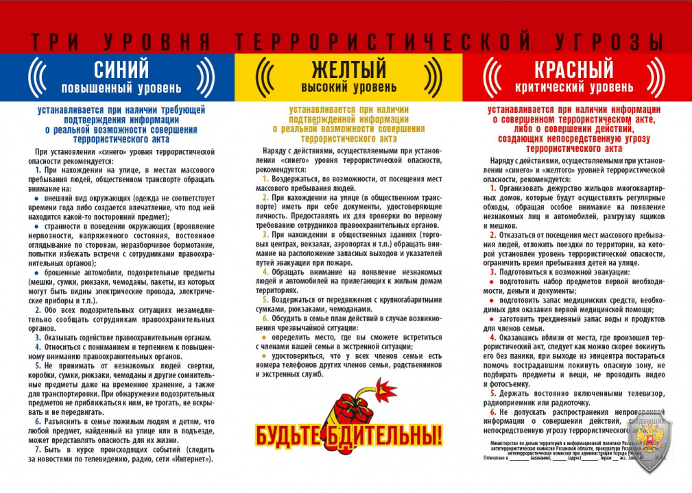 Памятка гражданам об их действиях при установлении уровней террористической опасности