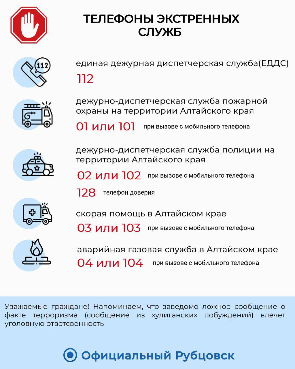 Уважаемые рубцовчане! Подготовили для вас полезную информацию - телефоны экстренных служб, по которым вы можете позвонить при угрозе террористического акта.