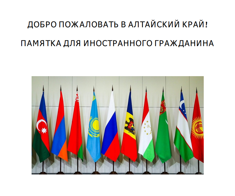 Данная памятка подготовлена в рамках реализации государственной программы Алтайского края «Противодействие экстремизму и идеологии терроризма в Алтайском крае» и направлена на интеграцию и социокультурную адаптацию иностранных граждан в Алтайском крае, а также на профилактику экстремизма и распространения радикальных идеологий в миграционной среде.