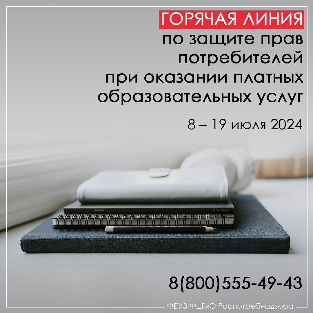 С 8 по 19 июля в Управлении Роспотребнадзора по Алтайскому краю стартует тематическая «горячая линия» по защите прав потребителей при оказании платных образовательных услуг. Специалисты дадут рекомендации по выбору образовательной организации для оказания платных образовательных услуг, укажут, на что обратить внимание при составлении договора, ответят на вопросы, касающиеся оплаты и возврата средств за обучение, помогут в оформлении претензии.