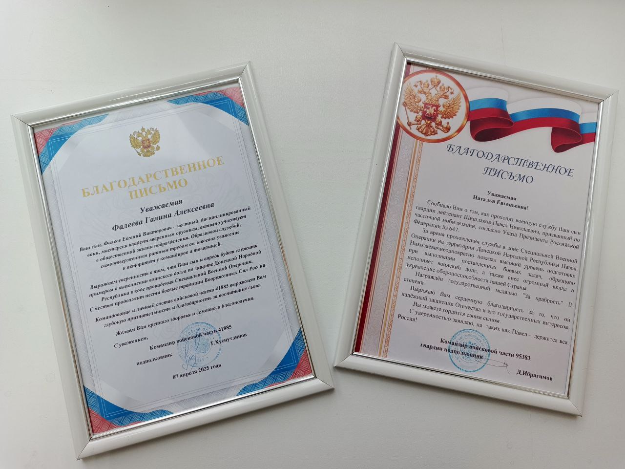 По просьбе командиров двух войсковых частей Российской Федерации заместитель Главы Администрации города Рубцовска Александр Шашок вручил благодарственные письма Наталье Шишлаковой и Галине Фалеевой - матерям солдат, которые в настоящее время проходят службу в зоне специальной военной операции.