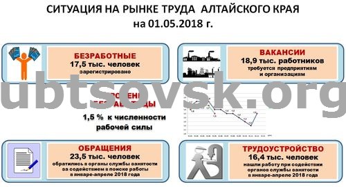 В целях поиска подходящей работы за 4 месяца 2018 года в службу занятости Алтайского края обратилось 23,5 тыс. человек. За этот же период трудоустроены 16,4 тыс. человек. Уровень трудоустройства граждан возрос с 68,9 % в январе-апреле 2017 года до 70,0 % в соответствующем периоде 2018 года.