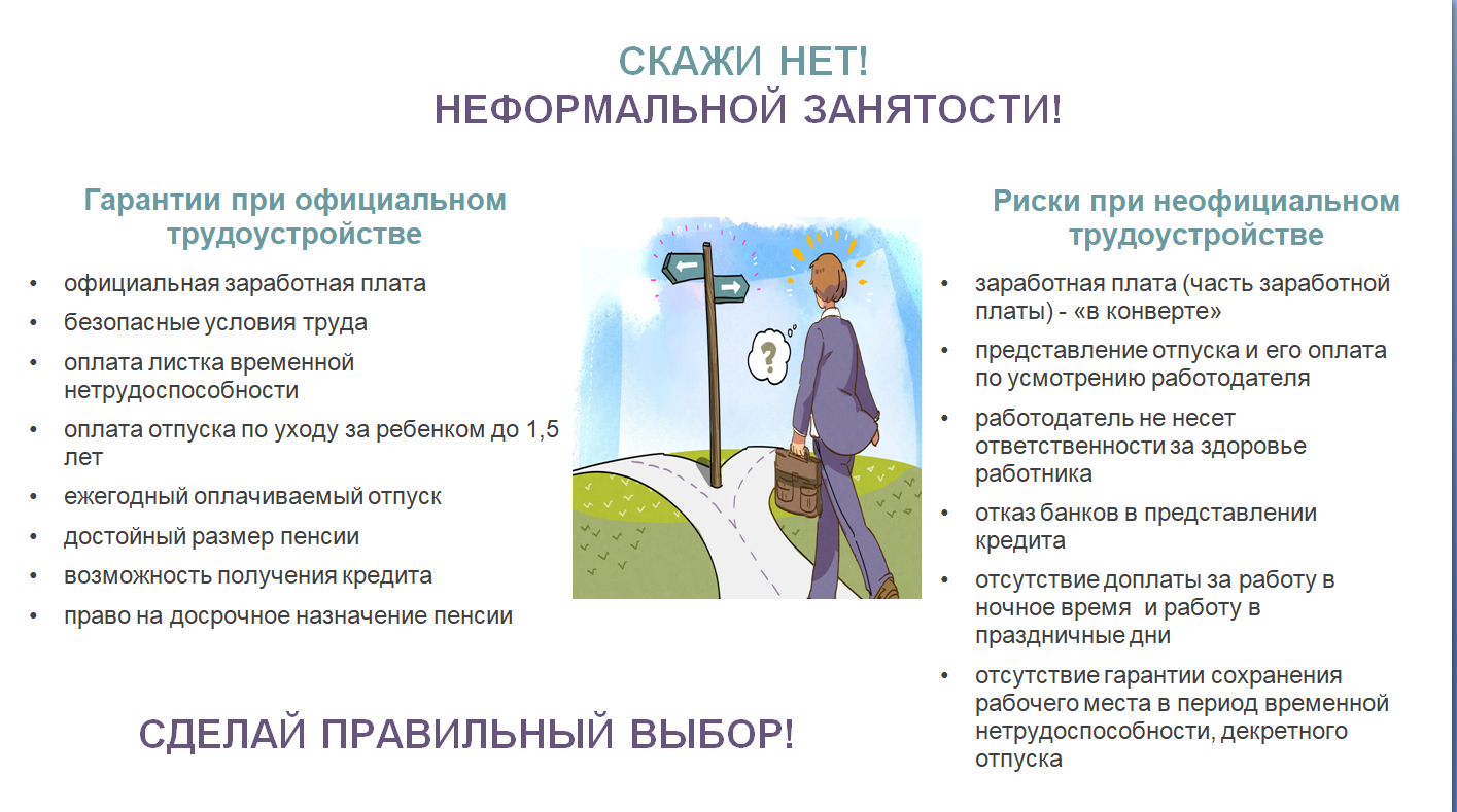 Неформальная занятость и зарплата «в конверте» продолжает оставаться одной из самых актуальных проблем в отношениях между работодателем и работником. Работодатели стремятся держать значительную часть доходов «в тени». Многие предприниматели «прячут» часть зарплаты своих наемных работников от официального оформления, чтобы сэкономить на налогах. Однако последствия теневой занятости достаточно серьезны. От легализации трудовых отношений, их оформления зависят социальные гарантии граждан: возможность заявить социальные и имущественные вычеты, получить пенсионное и социальное обеспечение и др."