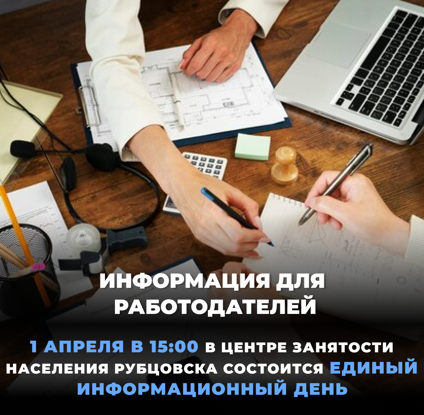 1 апреля в 15:00 в Центре занятости населения Рубцовска по адресу: г. Рубцовск, пр-кт Ленина, 47а, состоится Единый информационный день по теме: «Повышение социальной ответственности работодателей - путь к эффективной занятости населения». Приглашаем руководителей организаций всех форм собственности города Рубцовска принять участие в данном мероприятии.