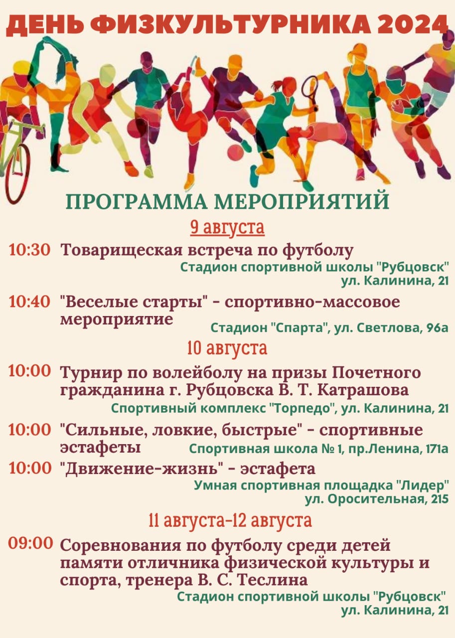 День физкультурника ежегодно отмечают во вторую субботу августа. В этом году праздник выпадает на 10 августа. В этот день в Рубцовске пройдут спортивные мероприятия: