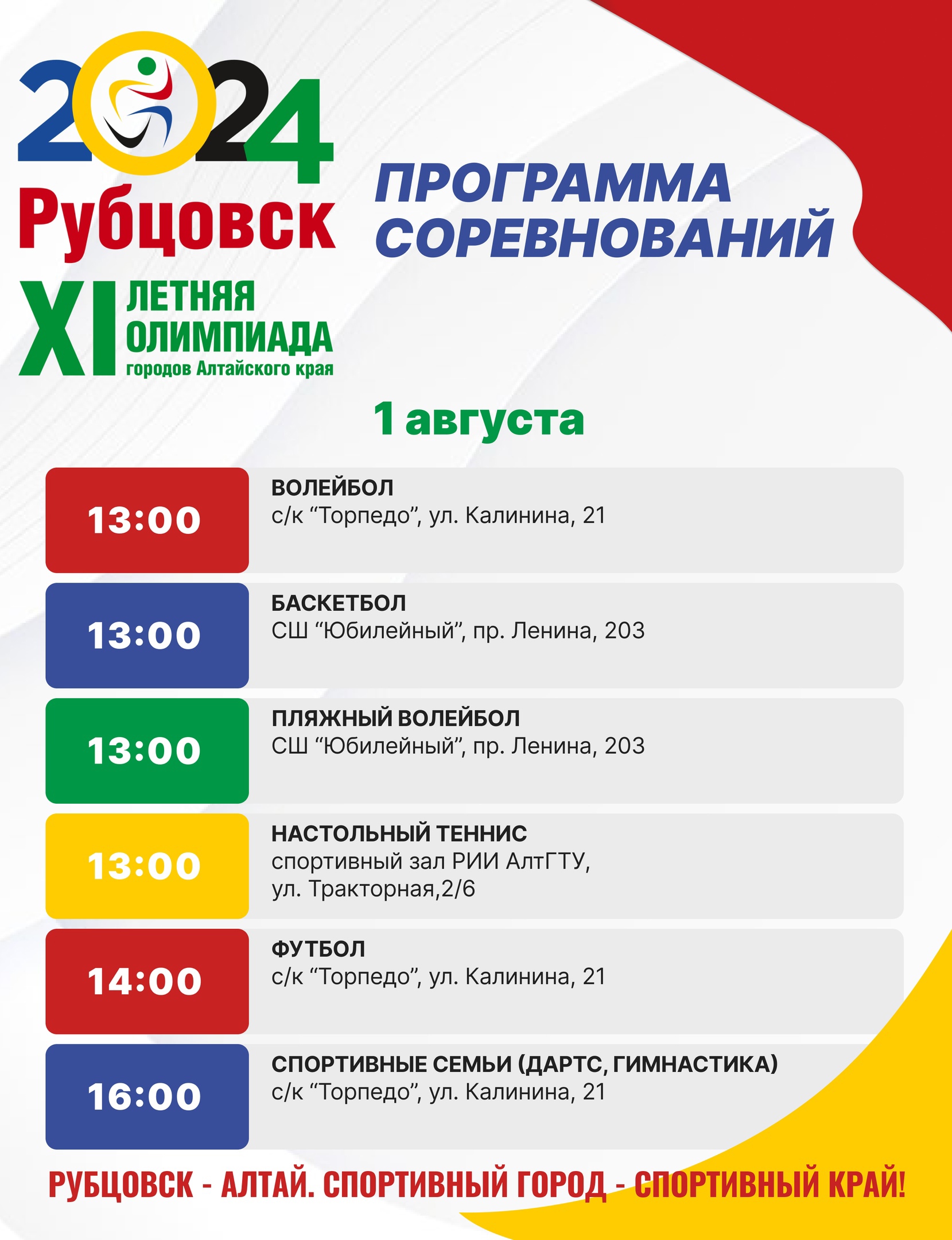 Знакомим с программой соревнований, чтобы вы могли спланировать свое время и быть в курсе спортивных событий. Вас ждут захватывающие состязания по 13 видам спорта. Уверены, что каждый найдет для себя что-то по душе! В городе идет подготовка спортивных объектов к Олимпиаде. Для спортсменов готовят места для проживания, гастролокации, а также культурную программу. Открытие Олимпиады состоится 2 августа в 18:00.