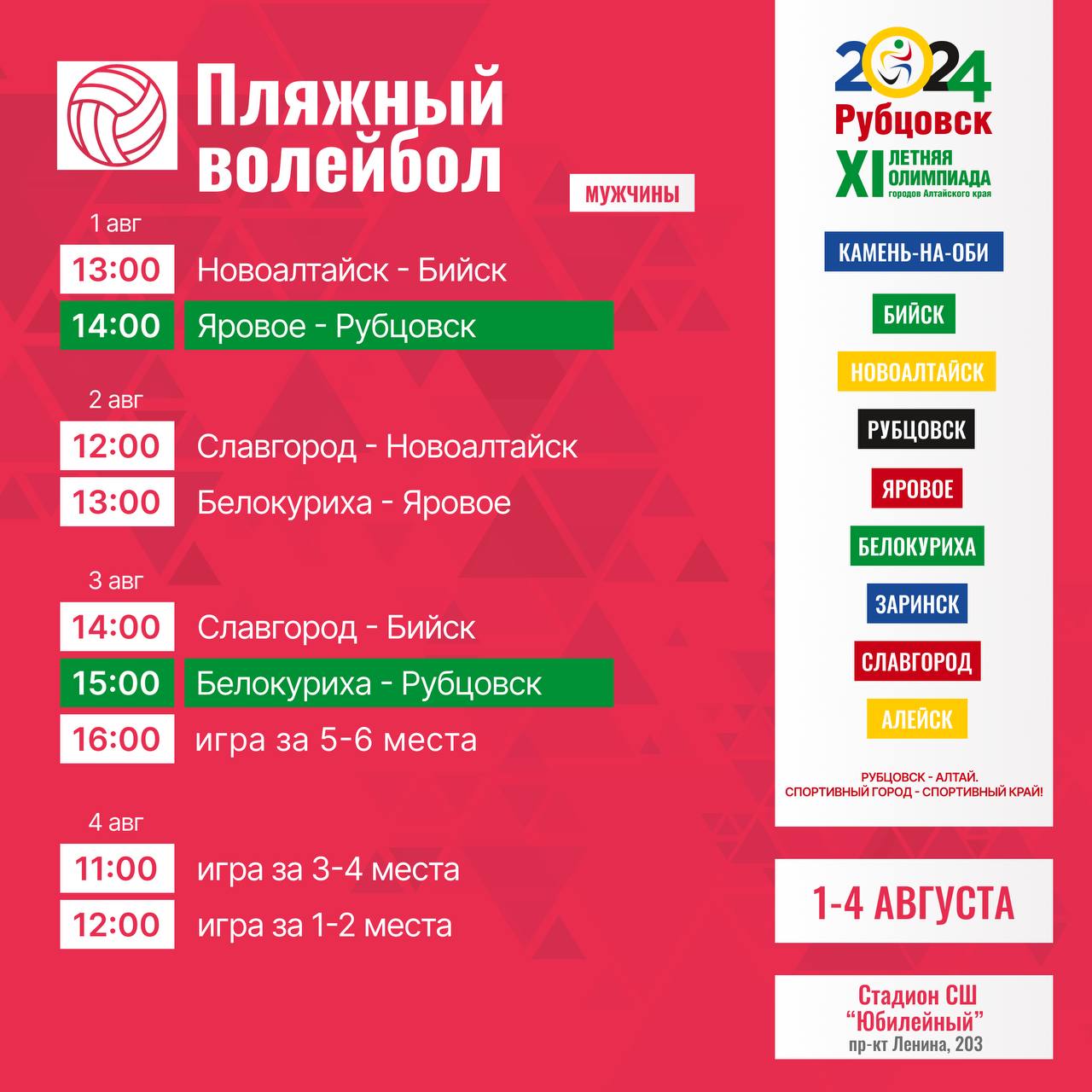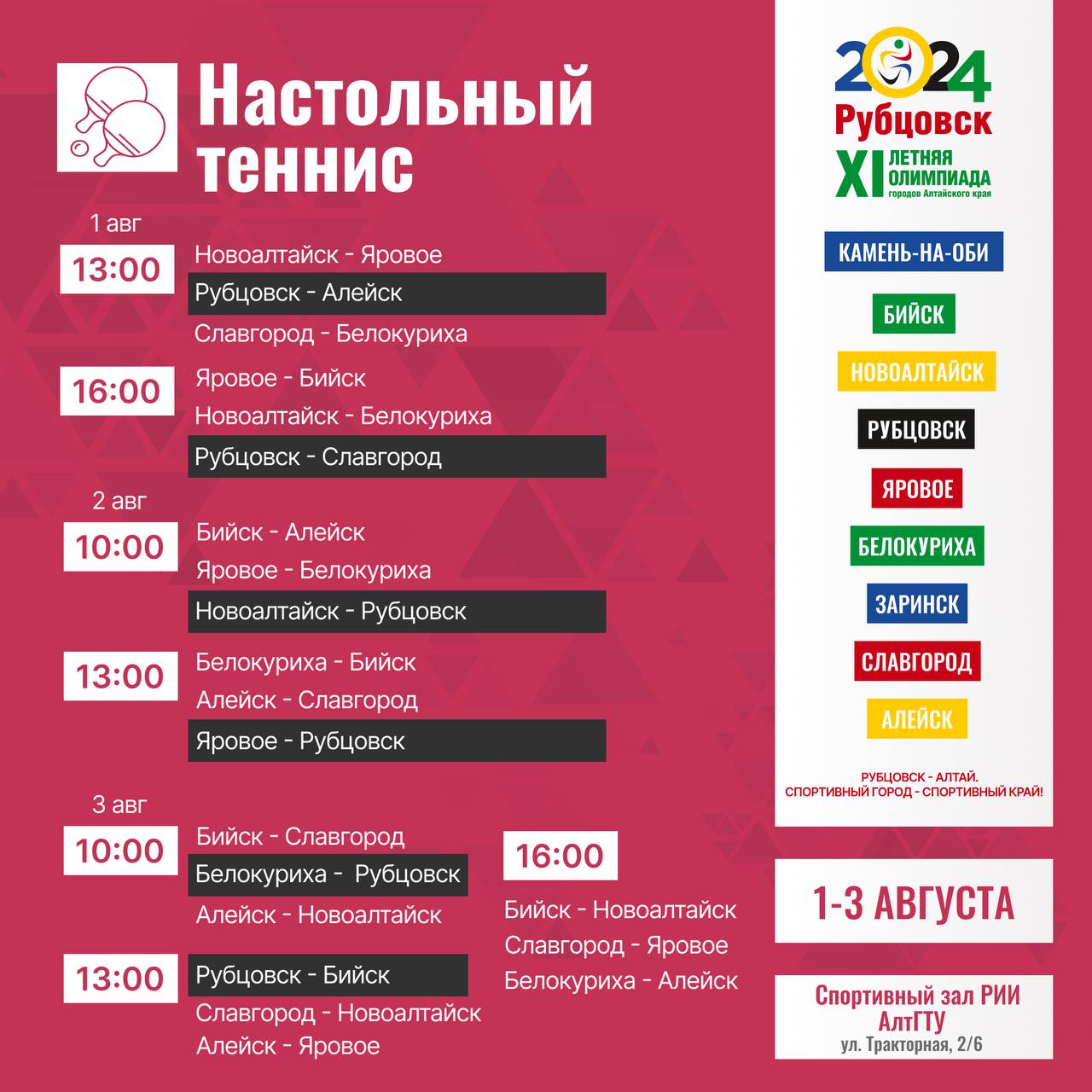 На протяжении четырех дней спортсмены из девяти городов края будут соревноваться в 13 дисциплинах. Уже в 13:00 начнутся первые спортивные баталии. Сегодня команды из Рубцовска будут соревноваться в мужском и женском баскетболе, волейболе — классическом и пляжном, настольном теннисе, полиатлоне, греко-римской борьбе, а также примут участие в соревнованиях среди спортивных семей.
