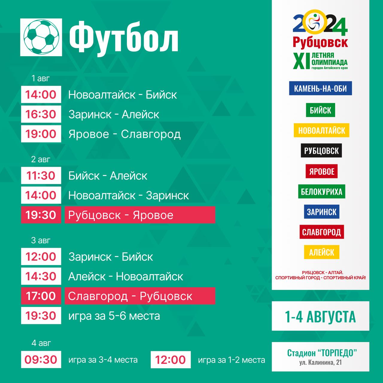 Напоминаем, что открытие XI летней Олимпиады городов Алтайского края состоится 2 августа в 18:00 на стадионе "Торпедо".