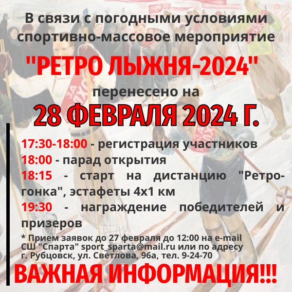 В связи с погодными условиями спортивно-массовое мероприятие «Ретро Лыжня-2024» перенесено на 28 февраля 18:00. Об этом сообщили в управлении культуры, спорта и молодежной политики Рубцовска. Мероприятие состоится на Трассе здоровья в районе набережной им. Н.Ф. Петрова. В соревнованиях могут принимать участие рубцовчане и жители близлежащих районов.