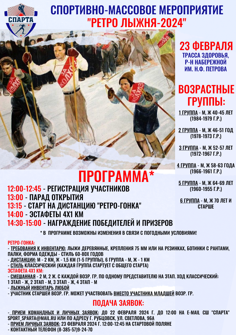 23 февраля в Рубцовске на Трассе здоровья в районе набережной имени Н.Ф. Петрова состоится традиционное спортивно-массовое мероприятие «Ретро Лыжня-2024». В соревнованиях могут принять участие рубцовчане по следующим возрастным группам:
