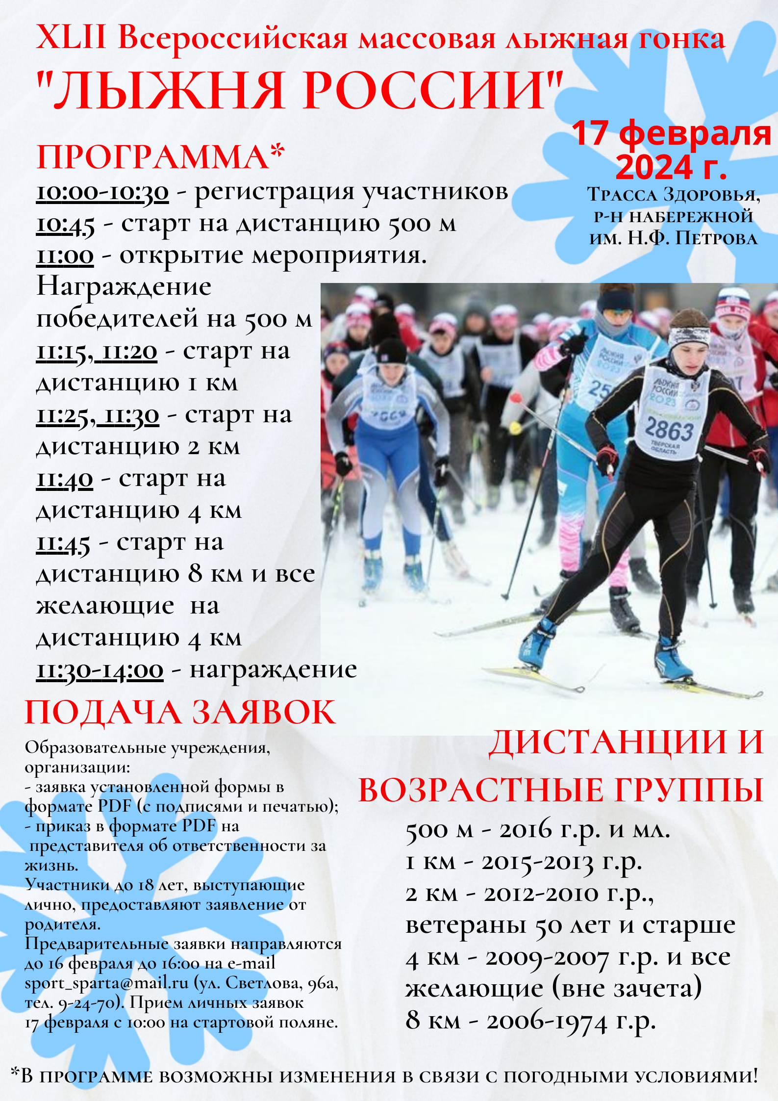 17 февраля на Трассе Здоровья в районе набережной имени Н.Ф. Петрова состоится XLII Всероссийская массовая лыжная гонка «Лыжня России». Регистрация участников начнется в 10:00, старт будет дан в 10:45. В рамках мероприятия пройдут забеги на различные дистанции: 500 метров (для участников 2016 года рождения и младше), 1, 2, 4 и 8 километров.
