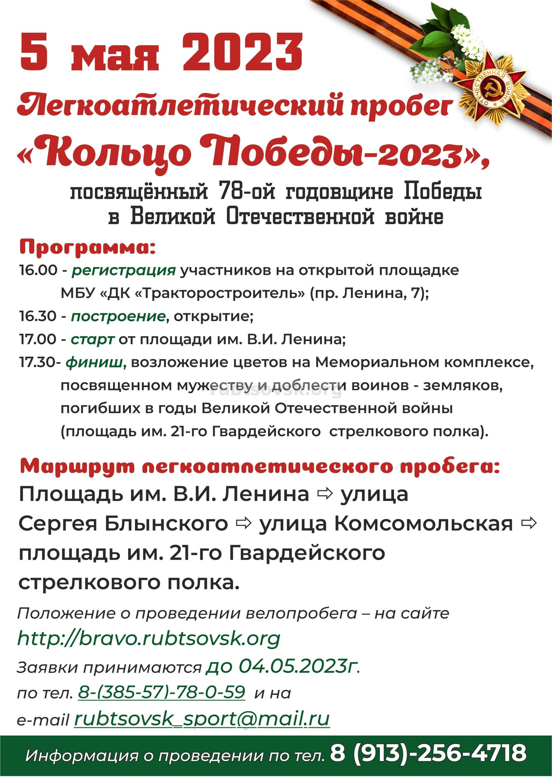 5 мая пройдет легкоатлетический пробег "Кольцо Победы-2023", посвященный 78-ой годовщине Победы в Великой Отечественной войне.