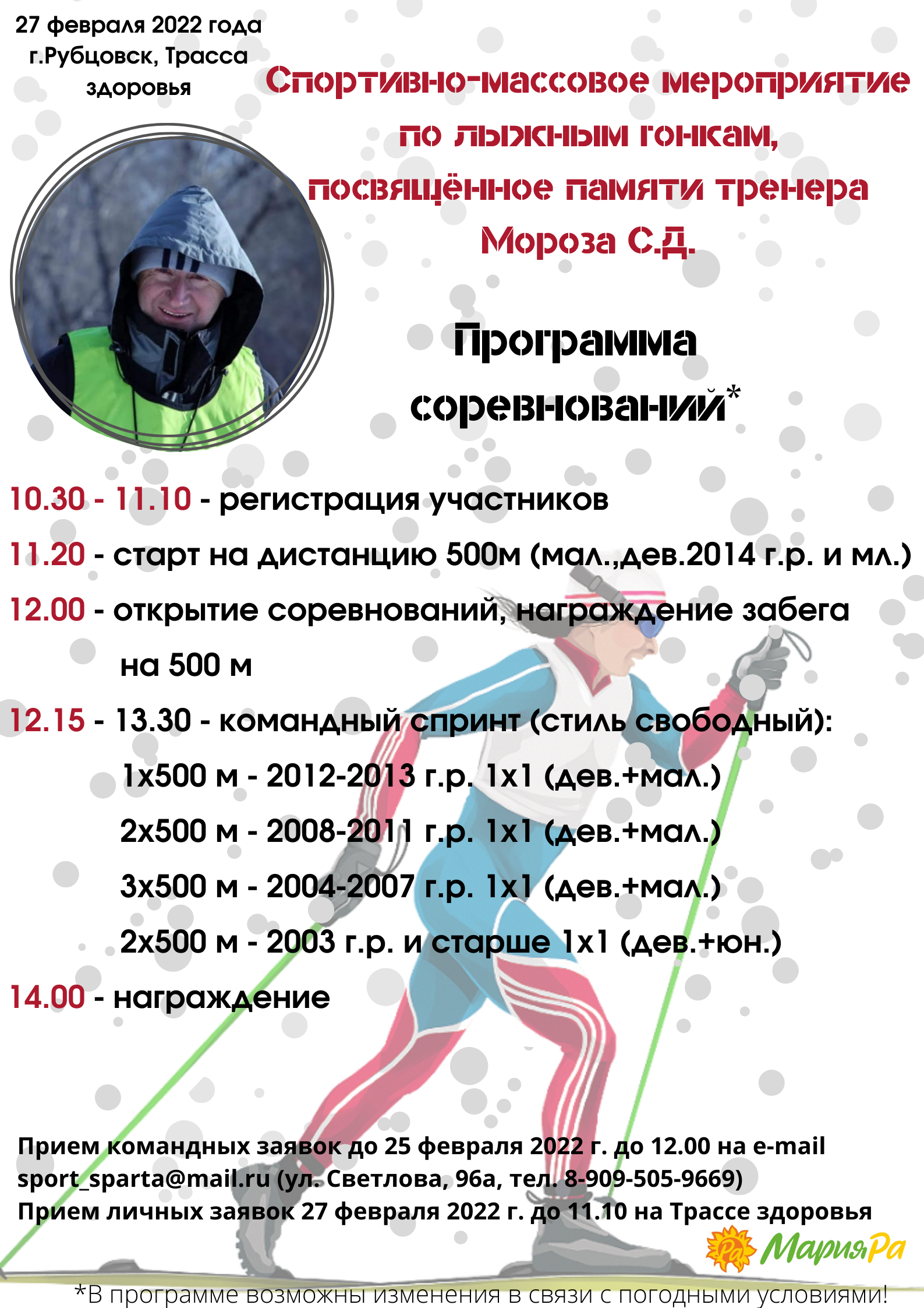 27 февраля на Трассе здоровья в районе набережной им. Н.Ф. Петрова прошло спортивно-массовое мероприятие по лыжным гонкам, посвященное памяти тренера Мороза Сергея Дмитриевича. Первыми на старт вышли участники 2014 г.р. и младше. Им предстояло преодолеть дистанцию в 500 м свободным стилем. В 12 часов состоялось торжественное открытие соревнований. После слов приветствия наградили призеров в самой младшей возрастной группе.