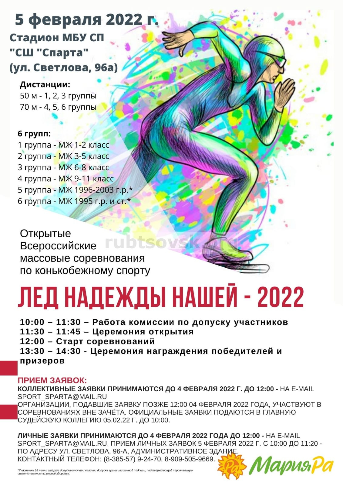 5 февраля 2022 г. на стадионе МБУ СП "СШ "Спарта" прошли открытые Всероссийские соревнования по конькобежному спорту "Лёд надежды нашей-2022". В соревнованиях приняли участие 125 человек.