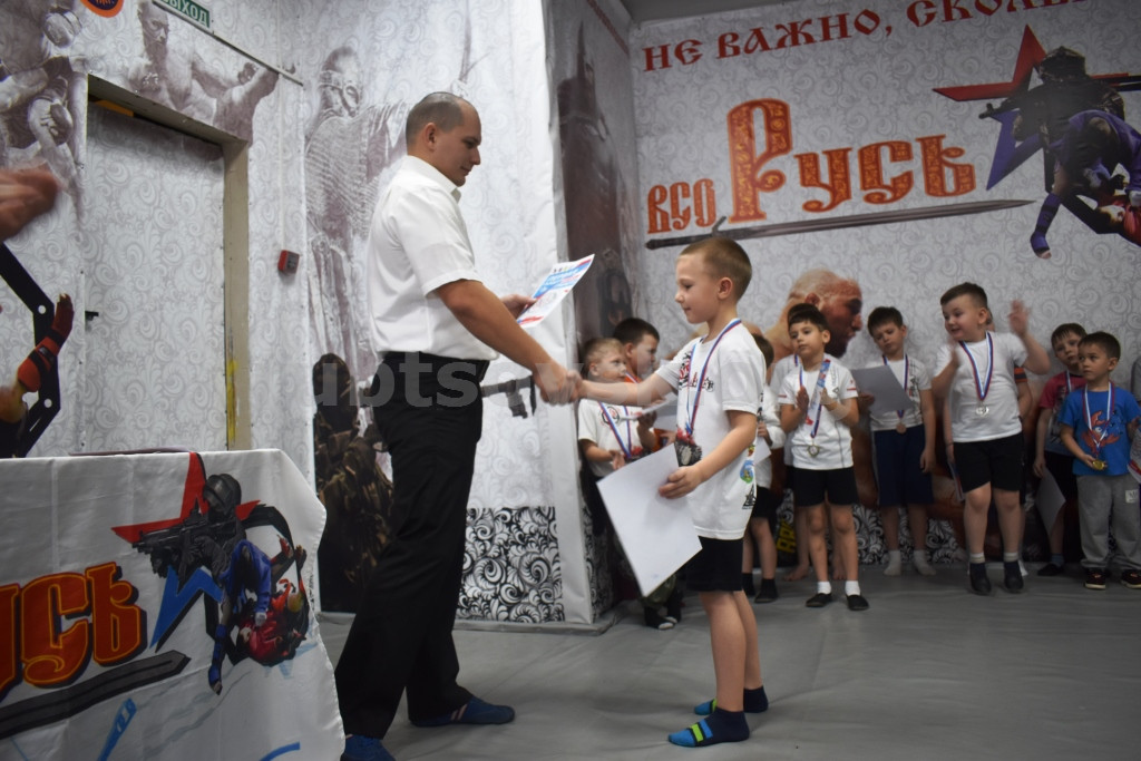 Днем спарринги стали серьезнее: воспитанникам от 8 до 13 лет разрешалось бить соперника руками, допускались болевые и удушающие приемы по правилам ОСЕ.