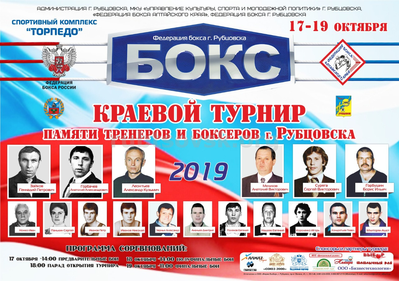 17 октября в Рубцовске стартовал международный турнир по боксу памяти тренеров и боксеров города среди юношей 2002-2007 годов рождения, сообщает "Местное время". Соревнования проходят в спорткомплексе «Торпедо». В турнире принимают участие 109 юных боксеров из разных городов и районов Алтайского края, Сибири, а также из трех стран ближнего зарубежья: Кыргызстана, Узбекистана и Казахстана. Спортсмены выступают в весовых категориях от 44,5 кг до 69 кг. Рубцовск представляют 29 юношей.