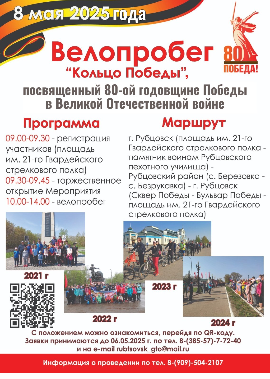 Маршрут велопробега: площадь им. 21-го Гвардейского стрелкового полка - памятник Воинам Рубцовского пехотного училища) - село Березовка - село Безрукавка - Сквер Победы - площадь им. 21-го Гвардейского стрелкового полка.