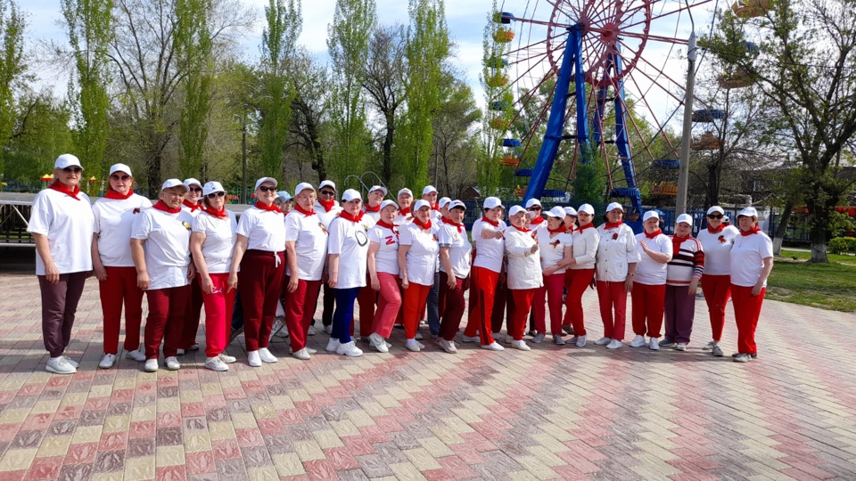 Коллектив женщин пожилого возраста, одетых в белые футболки, кепки и красные брюки, синхронно исполнил танец «Смуглянка».