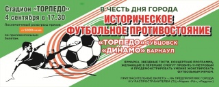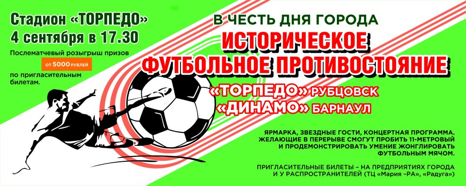 В рамках празднования Дня города Рубцовска 4 сентября в 17:30 на стадионе "Торпедо" состоится традиционный футбольный матч "Торпедо" (г.Рубцовск) - "Динамо"( г.Барнаул). В программе: ярмарка, звездные гости, концертная программа. А также желающие в перерыве смогут пробить 11-метровый и продемонстрировать умение жонглировать футбольным мячом. Послематчевый розыгрыш призов по пригласительным билетам. Билеты можно приобрести у распространителей. Приглашаем всех болельщиков на футбол!