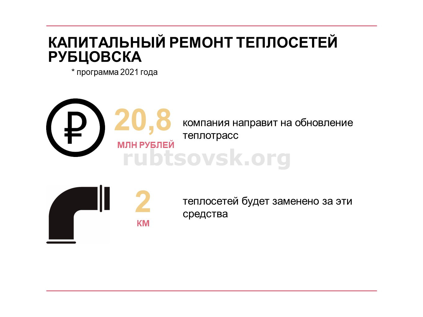 Капитальный ремонт теплотрасс пройдет в Рубцовске в 2021 году. Специалисты СГК включили в программу ремонта шесть участков, где появятся 2 километра новых коммуникаций. На обновление трубопроводов компания направит 20,8 миллионов рублей.