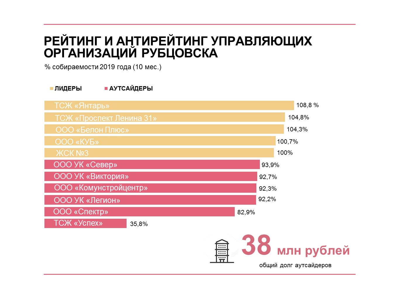 Специалисты теплосбытового подразделения Сибирской генерирующей компании составили рейтинг и антирейтинг управляющих организаций Рубцовска, подсчитав их долги за тепло и горячую воду. Лидеров и антилидеров определяли по проценту собираемости платежей. Показатель собираемости определялся при подсчете денежных средств, которые управляющая организация перечислила ресурсоснабжающей организации за 10 месяцев 2019 года. По данным на 1 ноября, лучшим по собираемости оплаты за тепло и горячую воду стало ТСЖ «Янтарь». Товариществ перечислило 108,8% платежей. Превышение 100% порога обычно возникает при активизации управляющей организацией работы с должниками.