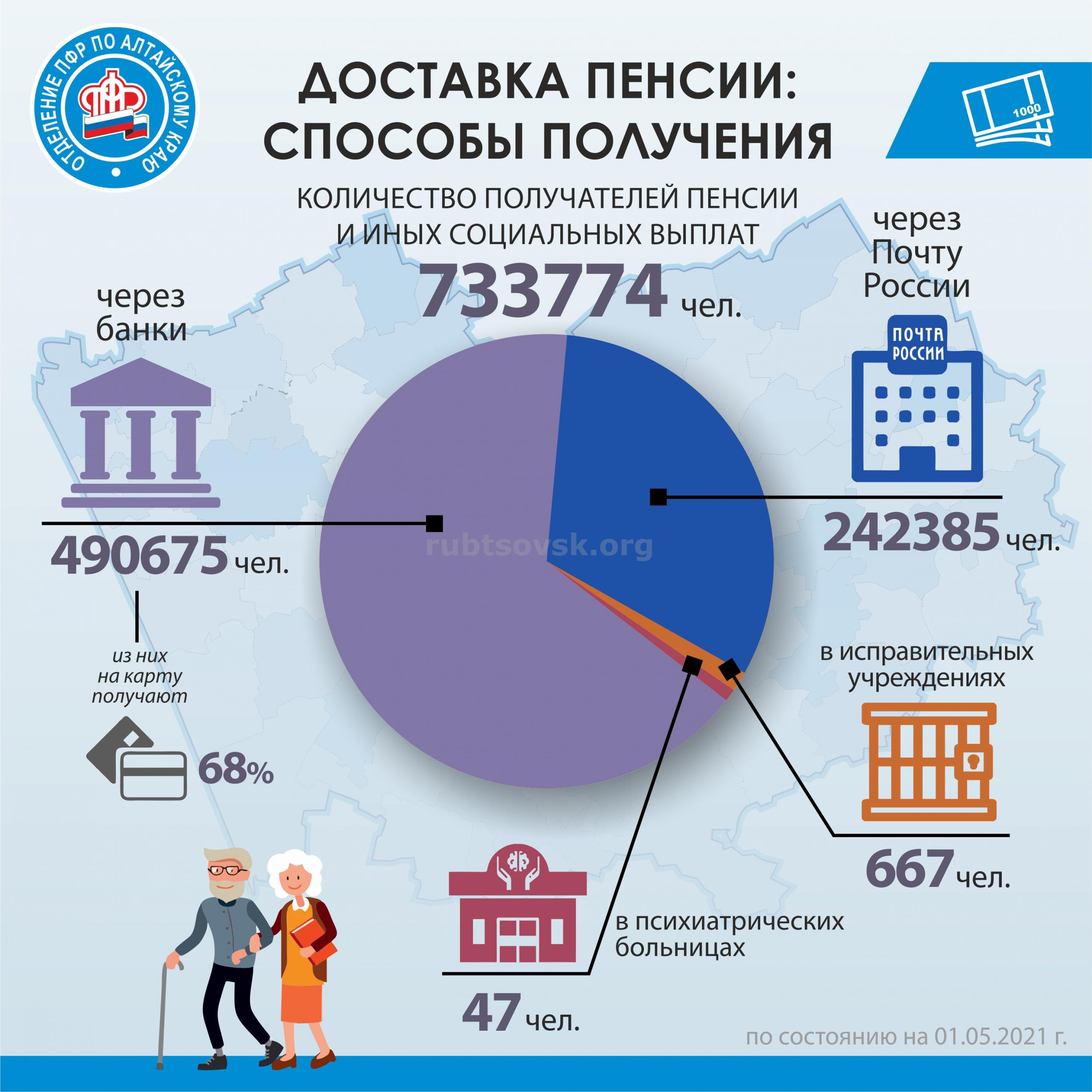 В Алтайском крае доставка пенсии и иных социальных выплат осуществляется через УФПС Алтайского края АО "Почта России" и через 24 кредитные организации, которые заключили договоры о доставке пенсии с Пенсионным фондом.